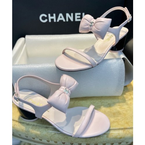 • 샤넬 리본 스트랩 미들힐 핑크 샌들
